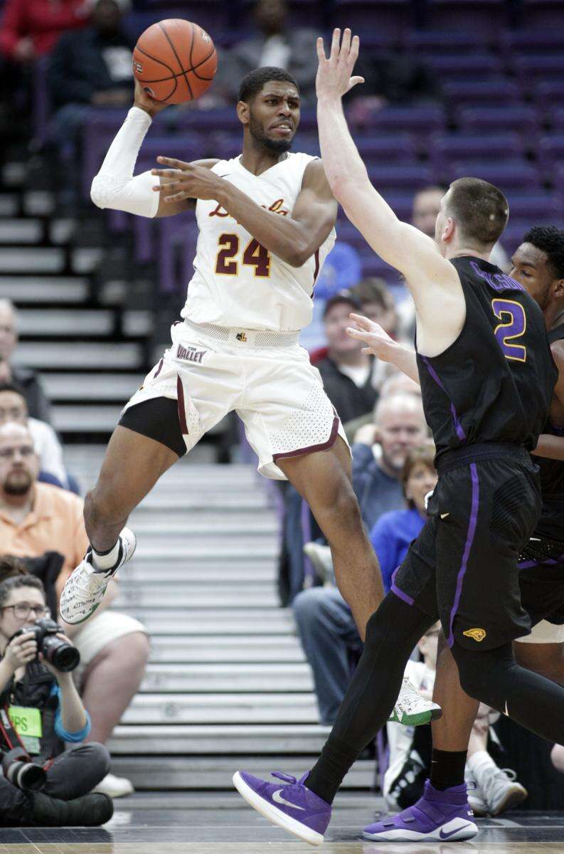 Loyola's Aundre Jackson (24) elevates to pass the ball over Northern Iowa's Klint Carlson (2) during the second half of an NCAA college basketball game in the quarterfinals of the Missouri Valley Conference tournament, Friday, March 2, 2018, in St. Louis. Loyola beat Northern Iowa 54-50. (AP Photo/Tom Gannam)