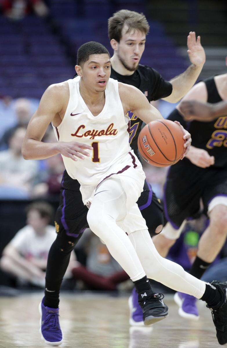 Loyola's Lucas Williamson (1) drives right past Northern Iowa's Hunter Rhodes during the first half of an NCAA college basketball game in the quarterfinals of the Missouri Valley Conference tournament, Friday, March 2, 2018, in St. Louis. (AP Photo/Tom Gannam)