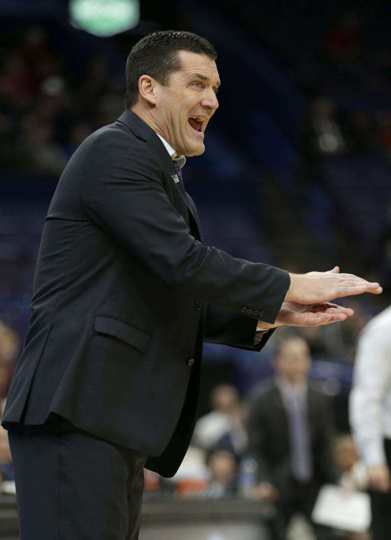 Northern Iowa head coach Ben Jacobson reacts to a call during the second half of an NCAA college basketball game against the Loyola in the quarterfinals of the Missouri Valley Conference tournament, Friday, March 2, 2018, in St. Louis. Loyola beat Northern Iowa 54-50. (AP Photo/Tom Gannam)