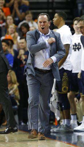 Notre Dame head coach Mike Brey directs his team against Virginia during the first half of an NCAA college basketball game in Charlottesville, Va., Saturday, March 3, 2018. (AP Photo/Steve Helber) The Associated Press