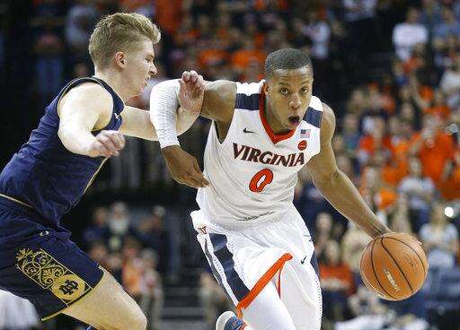 Virginia guard Devon Hall (0) drives past Notre Dame guard Rex Pflueger (0) during the second half of an NCAA college basketball game in Charlottesville, Va., Saturday, March 3, 2018. Virginia won the game 62-57. (AP Photo/Steve Helber) The Associated Press