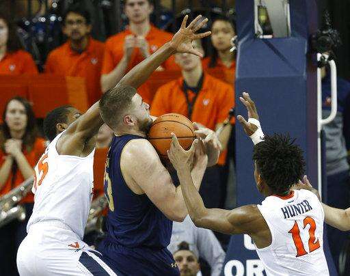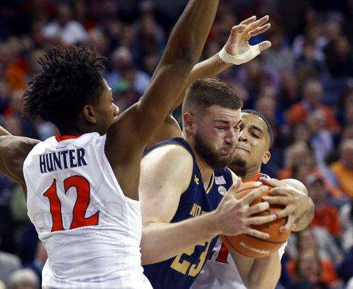 Notre Dame forward Martinas Geben (23) is pressured by Virginia guard De'Andre Hunter (12) and Virginia forward Isaiah Wilkins, right, during the first half of an NCAA college basketball game in Charlottesville, Va., Saturday, March 3, 2018. (AP Photo/Steve Helber) The Associated Press