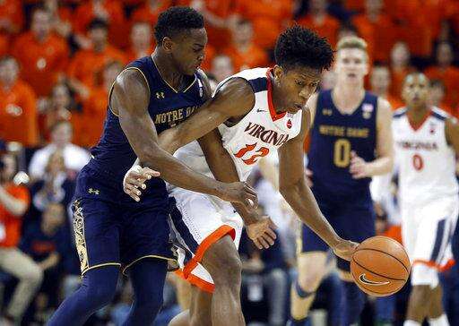 Notre Dame guard Rex Pflueger (0) stretches for a loose ball as Virginia forward Isaiah Wilkins, back, follows during the first half of an NCAA college basketball game in Charlottesville, Va., Saturday, March 3, 2018. (AP Photo/Steve Helber) The Associated Press