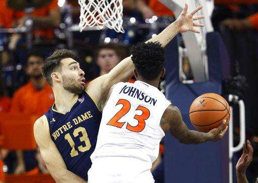 Virginia guard Nigel Johnson (23) takes a shot around Notre Dame guard Nikola Djogo (13) during the first half of an NCAA college basketball game in Charlottesville, Va., Saturday, March 3, 2018. (AP Photo/Steve Helber) The Associated Press