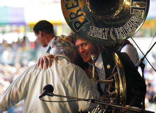 A photo shows him playing the brass sousaphone, which has "Preservation Hall, New Orleans" painted on the bell.