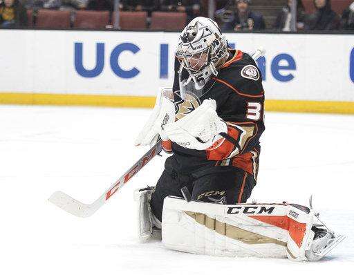 Anaheim Ducks goaltender John Gibson blocks a Columbus Blue Jackets shot during the first period of an NHL hockey game in Anaheim, Calif., Friday, March 2, 2018. (AP Photo/Kyusung Gong) The Associated Press
