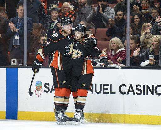 Anaheim Ducks left wing Andrew Cogliano, right, celebrates his goal with defenseman Cam Fowler in the second period of an NHL hockey game against the Columbus Blue Jackets in Anaheim, Calif., Friday, March 2, 2018. (AP Photo/Kyusung Gong) The Associated Press