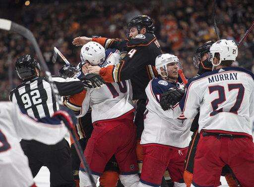 A brawl breaks out between the Anaheim Ducks and the Columbus Blue Jackets during the second period of an NHL hockey game in Anaheim, Calif., Friday, March 2, 2018. (AP Photo/Kyusung Gong) The Associated Press