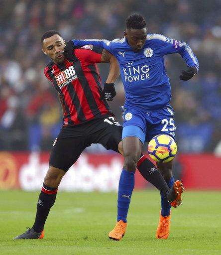 AFC Bournemouth's Callum Wilson, left, and Leicester City's Wilfred Ndidi in action during the English Premier League soccer match at the King Power Stadium in Leicester, England, Saturday March 3, 2018. (Tim Goode/PA via AP) The Associated Press