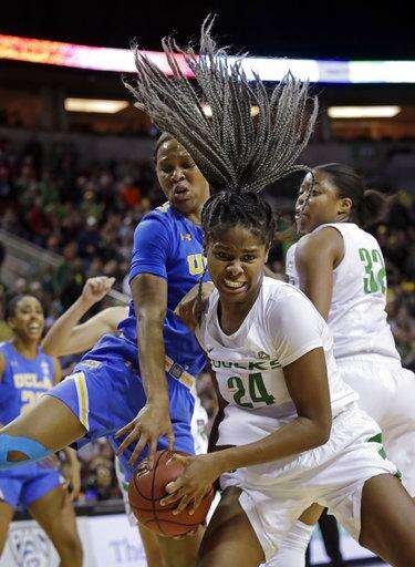 Oregon's Ruthy Hebard (24) comes down with a rebound in front of UCLA's Lajahna Drummer as Oregon's Oti Gildon, right, watches during the second half of an NCAA college basketball game in the semifinals of the Pac-12 women's tournament Saturday, March 3, 2018, in Seattle. Oregon won 65-62. (AP Photo/Elaine Thompson) The Associated Press