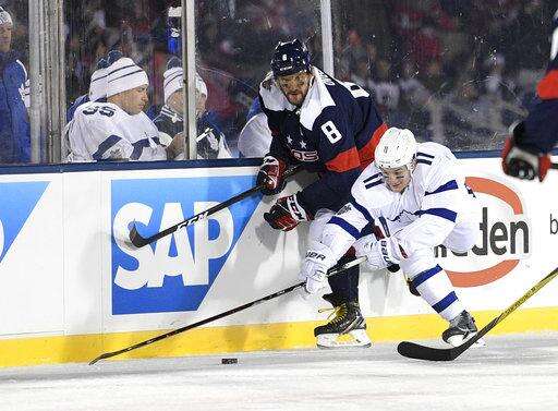 Washington Capitals left wing Alex Ovechkin (8), of Russia, battles for the puck Toronto Maple Leafs center Zach Hyman (11) during the first period of an NHL hockey game, Saturday, March 3, 2018, in Annapolis, Md. (AP Photo/Nick Wass) The Associated Press