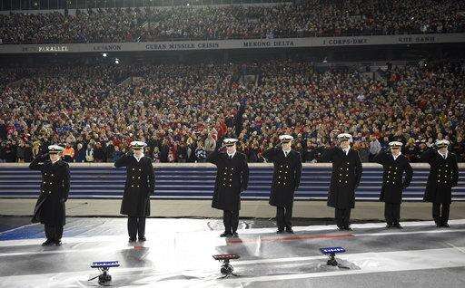 Navy midshipmen stand for the national anthem before an NHL hockey game between the Washington Capitals and the Toronto Maple Leafs, Saturday, March 3, 2018, in Annapolis, Md. The Capitals won 5-2. (AP Photo/Nick Wass) The Associated Press
