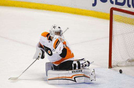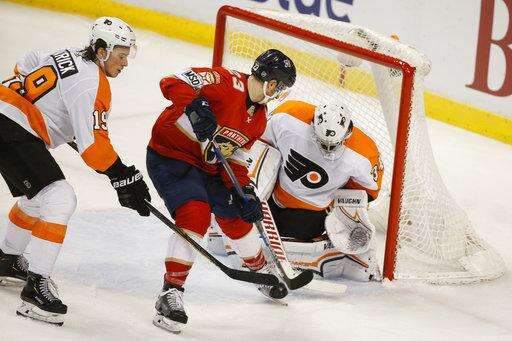 A shot by Florida Panthers right wing Evgenii Dadonov gets past Philadelphia Flyers goaltender Petr Mrazek for a goal during the second period of an NHL hockey game, Sunday, March 4, 2018, in Sunrise, Fla. (AP Photo/Wilfredo Lee) The Associated Press