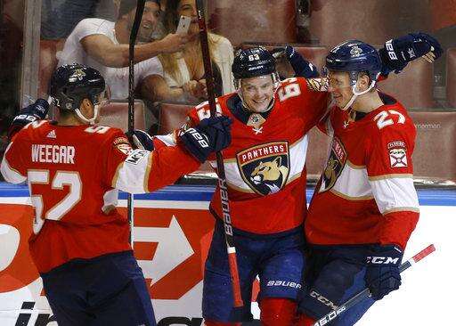 Florida Panthers center Aleksander Barkov (16) is congratulated by teammates after scoring during the first period of an NHL hockey game against the Philadelphia Flyers, Sunday, March 4, 2018, in Sunrise, Fla. (AP Photo/Wilfredo Lee) The Associated Press