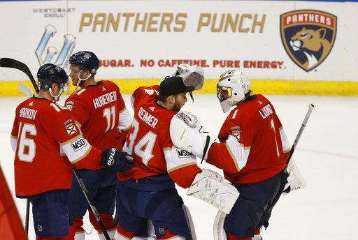 Florida Panthers players congratulate each other after they defeated the Philadelphia Flyers in an NHL hockey game, Sunday, March 4, 2018, in Sunrise, Fla. From left to right, are: Aleksander Barkov, Jonathan Huberdeau, James Reimer and Roberto Luongo. (AP Photo/Wilfredo Lee) The Associated Press
