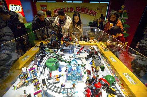 FILE - In this Saturday, Dec. 23, 2017 file photo, people look at a display of Lego creations at Hamleys toy store during its grand opening in Beijing. In its annual report Tuesday March 6, 2018, toy maker Lego says its earnings and sales fell in 2017 for the first time since 2004. (AP Photo/Mark Schiefelbein, File)