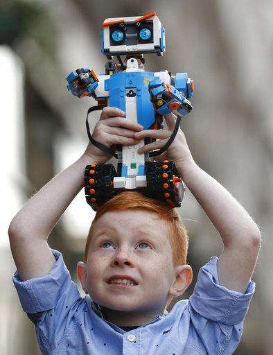 FILE- In this Oct. 12, 2017, file photo, Tristan Robertson-Jeyes, 6, plays with Vernie a "LEGO Boost" during a media opportunity in London. Lego presents annual results on Tuesday, March 6, 2018. (AP Photo/Kirsty Wigglesworth, File)