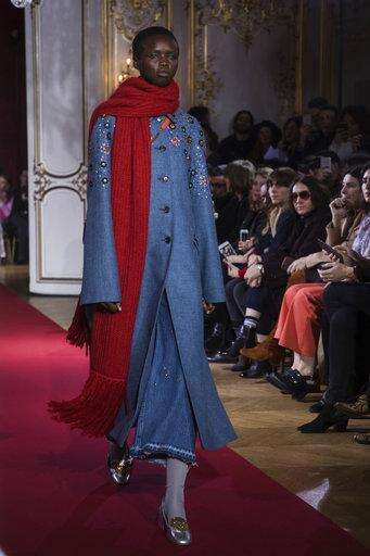 Green, black, beige, gray, russet evoked the months of decay, contrasting with sections of sky blue. Huge statement scarfs in vermilion and saffron added a touch of seasonal humor.