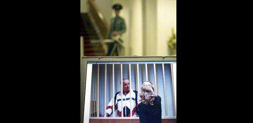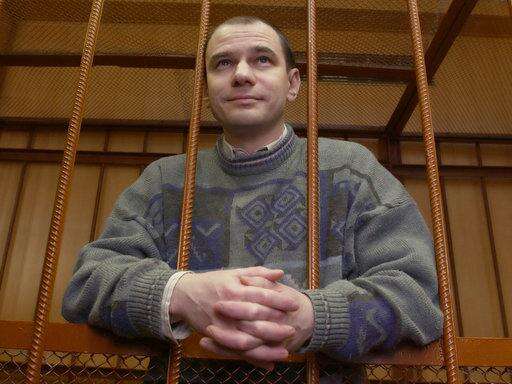 FILE - In this Wednesday, April 7, 2004 file photo, Russian arms control researcher Igor Sutyagin stands behind bars as he listens to the verdict as he is sentenced to 15-years in prison for spying, in a courtroom in Moscow. Sergei Skripal, a former Russian spy who fell critically ill in Britain on Monday March 6, 2018, after exposure to an "unknown substanceâ, was one of four prisoners who were pardoned and released from custody in 2010 as part of a spy swap. Like Skripal, Igor Sutyagin moved to Britain after his release but he was loathe to leave Russia but had no choice. (AP Photo, file)