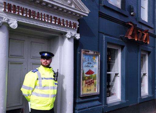 Police outside an Italian restaurant in Salisbury, England, Tuesday March 6, 2018, near to where former Russian spy double agent Sergei Skripal and his companion were found critically ill Sunday following exposure to an "unknown substance". 66-year old Skripal, and unidentified woman companion are being treated in hospital, after they were found unconscious on the park bench in Salisbury.(AP Photo/Frank Augstein)