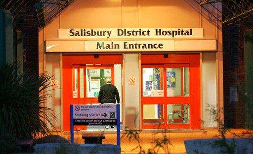 FILE - This is a Aug. 16, 2005 file photo of the main entrance of Salisbury District Hospital, in Salisbury, England. British media say a former Russian spy is in critical condition after coming into contact with an "unknown substance." Authorities did not identify the man, but the Press Association and other British media identified him Monday, March 5, 2018 as Sergei Skripal who was convicted in 2006 on charges of spying for Britain and sentenced to 13 years but was freed in 2010 in a U.S.-Russian spy swap. (Tim Ockenden/PA via AP, File)