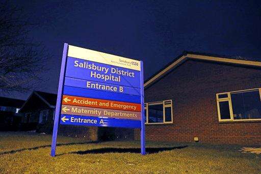 A view of the sign at Salisbury District Hospital where the British media reported that a former Russian spy was in critical condition after coming into contact with an "unknown substance," in Wiltshire, England, Monday March 5, 2018. British media identified him as Sergei Skripal, 66, who was convicted in Russia on charges of spying for Britain and sentenced in 2006 to 13 years in prison. Skripal was freed in 2010 as part of a U.S.-Russian spy swap. (Steve Parsons/PA via AP)