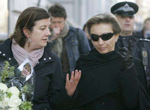 FILE - In this file photo dated Friday, Nov. 23, 2007, Marina Litvinenko wife of the former Russian intelligence officer Alexander Litvinenko, picture seen on flowers left, who was poisoned by polonium 210, walks with an unidentified aide in London. Former KGB agent who defected to Britain and become a vocal Kremlin critic, Alexander Litvinenko died in November 2006, three weeks after drinking tea laced with a radioactive isotope at a London hotel. (AP Photo/Alastair Grant, FILE)