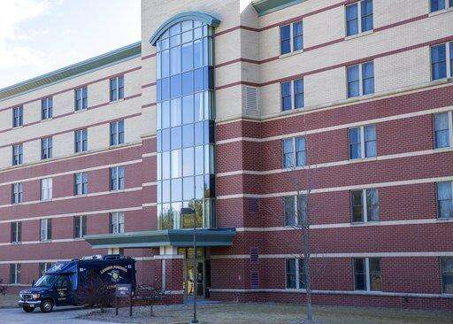 A crime scene response vehicle is parked outside Central Michigan University's Campbell Hall after a fatal shooting, Friday, March 2, 2018, in Mount Pleasant, Mich. More than 100 police officers, some heavily armed in camouflage uniforms, searched neighborhoods near the school Friday for a 19-year-old student suspected of killing his parents at the dormitory and then running from campus. (Cory Morse/The Grand Rapids Press-MLive.com via AP) The Associated Press
