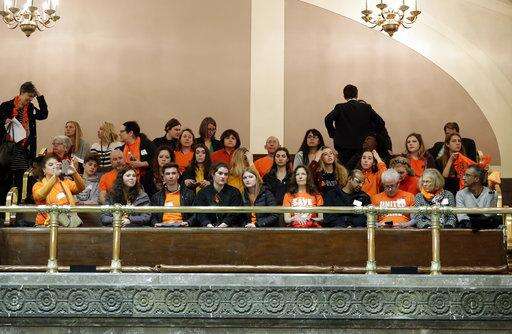 People wearing orange to oppose gun violence sit in a gallery of the Washington Senate, Tuesday, March 6, 2018, at the Capitol in Olympia, Wash. Later in the day Gov. Inslee was scheduled to sign a bill banning the sale and possession of gun bump stocks in the state of Washington. (AP Photo/Ted S. Warren) The Associated Press