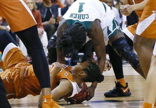 Brown drove for a layup in the closing seconds of the third quarter and Texas' Jordan Hosey fouled her hard. Brown was helped off the court. No flagrant was called, and Brown returned after the review. Baylor led 52-46 at the end of the third quarter.