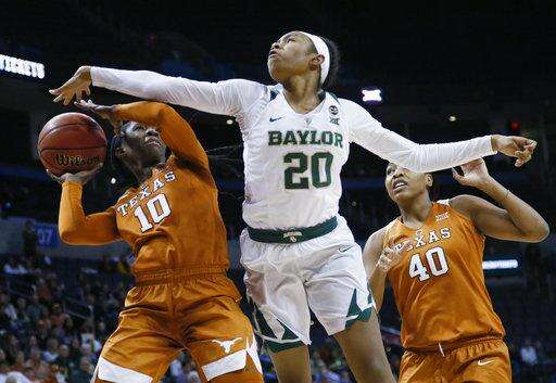 Baylor forward Dekeiya Cohen (1) reaches for the ball under Texas guard Ariel Atkins, bottom, in the first half of an NCAA college basketball game in the championship game of the women's Big 12 conference tournament in Oklahoma City, Monday, March 5, 2018. (AP Photo/Sue Ogrocki) The Associated Press