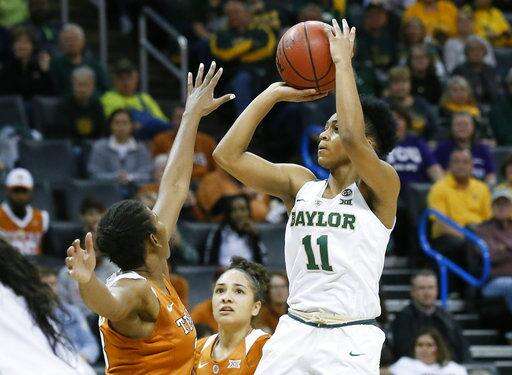 Baylor guard Alexis Morris (11) shoots over Texas guard Ariel Atkins, left, in the first half of an NCAA college basketball game in the championship game of the women's Big 12 conference tournament in Oklahoma City, Monday, March 5, 2018. (AP Photo/Sue Ogrocki) The Associated Press