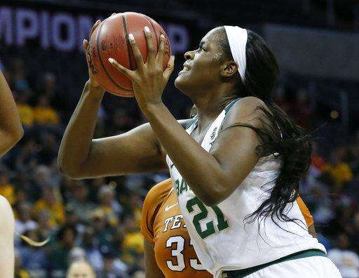 Baylor center Kalani Brown (21) shoots as Texas forward Jatarie White, right, defends, in the first half of an NCAA college basketball game in the championship game of the women's Big 12 conference tournament in Oklahoma City, Monday, March 5, 2018. (AP Photo/Sue Ogrocki) The Associated Press