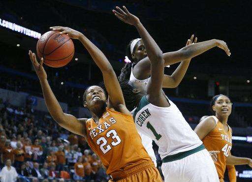 Texas guard Ariel Atkins (23) grabs a rebound in front of Baylor center Kalani Brown, top, and forward Dekeiya Cohen (1) in the first half of an NCAA college basketball game in the championship game of the women's Big 12 conference tournament in Oklahoma City, Monday, March 5, 2018. (AP Photo/Sue Ogrocki) The Associated Press
