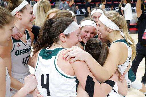 Green Bay players celebrate beating Wright State 62-44 after an NCAA college basketball game in the Horizon League Conference tournament championship in Detroit, Tuesday, March 6, 2018. (AP Photo/Paul Sancya)