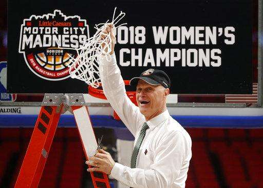 Green Bay head coach Kevin Borseth holds up the net and celebrates after defeating Wright State 62-44 after an NCAA college basketball game in the Horizon League conference tournament championship in Detroit, Tuesday, March 6, 2018. (AP Photo/Paul Sancya)