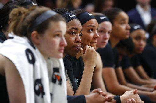 Wright State players sit on the bench and watch Green Bay celebrate after losing 62-44 in an NCAA college basketball game in the Horizon League conference tournament championship in Detroit, Tuesday, March 6, 2018. (AP Photo/Paul Sancya)