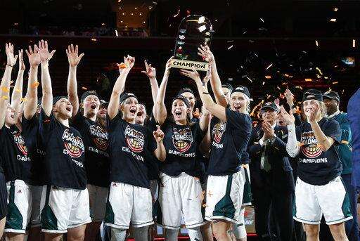 Green Bay guard Allie LeClaire kisses the trophy as she celebrates after defeating Wright State 62-44 after an NCAA college basketball game in the Horizon League conference tournament championship in Detroit, Tuesday, March 6, 2018. (AP Photo/Paul Sancya)