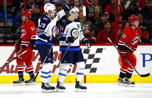 Winnipeg Jets' Patrik Laine (29) celebrates his goal with teammate Mark Scheifele (55) during the second period of an NHL hockey game against the Carolina Hurricanes, Sunday, March 4, 2018, in Raleigh, N.C. (AP Photo/Karl B DeBlaker)