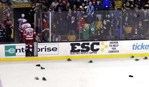 The Red Wings attacked first in the overtime but got a bad bounce off an official near the blue line to send the Bruins off on a rush. Marchand picked up a rebound off Krug's shot, moved it to his backhand and scored the winner, triggering an avalanche of the free green hats given out in honor of Irish Heritage Night.