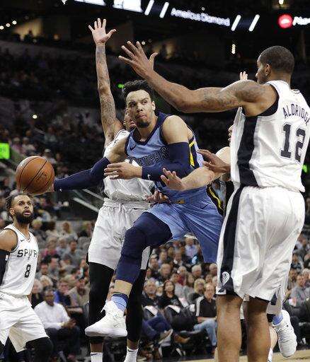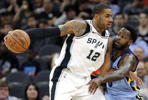 San Antonio Spurs forward LaMarcus Aldridge (12) is pressured by Memphis Grizzlies forward JaMychal Green, right, during the first half of an NBA basketball game, Monday, March 5, 2018, in San Antonio. (AP Photo/Eric Gay) The Associated Press