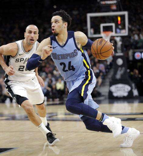Memphis Grizzlies forward Dillon Brooks (24) drives around San Antonio Spurs guard Manu Ginobili (20) during the first half of an NBA basketball game, Monday, March 5, 2018, in San Antonio. (AP Photo/Eric Gay) The Associated Press