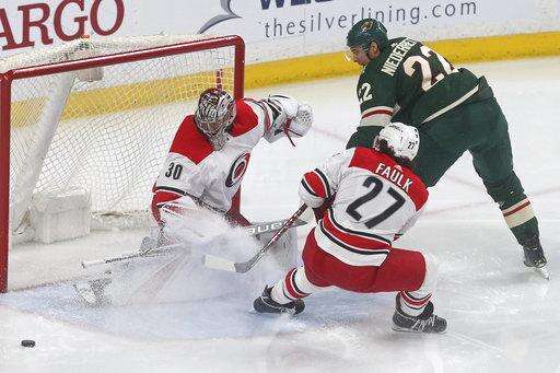 Dubnyk's last shutout was on Feb. 10, a 44-save performance against Chicago. ... Wild rookie D Nick Seeler was ruled out with a strained right biceps, two nights after he engaged in an old-style, bloody fight with Detroit's Luke Witkowski. ... Hurricanes LW Joakim Nordstrom missed his fourth straight game because of an upper-body injury. ... Spurgeon and Ryan Suter had two assists apiece. Wild defensemen have 166 points in 67 games, the second-most in the NHL behind Nashville. The franchise record is 169. ... The Hurricanes had 31 shots on goal and lead the NHL with 52 games of 30-plus shots.