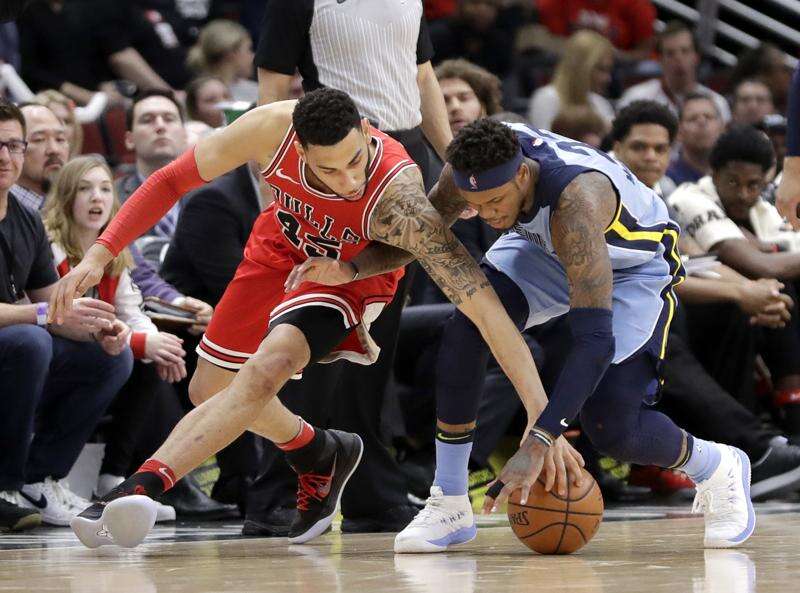 The Bulls' Denzel Valentine and the Grizzlies' Ben McLemore battle for a loose ball during the second half of Wednesday's game at the United Center. Associated Press