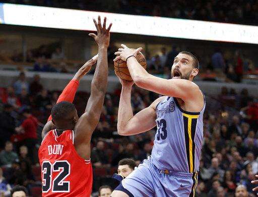 Memphis Grizzlies' Marc Gasol, right, drives to the basket as Chicago Bulls' Kris Dunn, left, defends during the first half of an NBA basketball game Wednesday, March 7, 2018, in Chicago. (AP Photo/Charles Rex Arbogast) The Associated Press