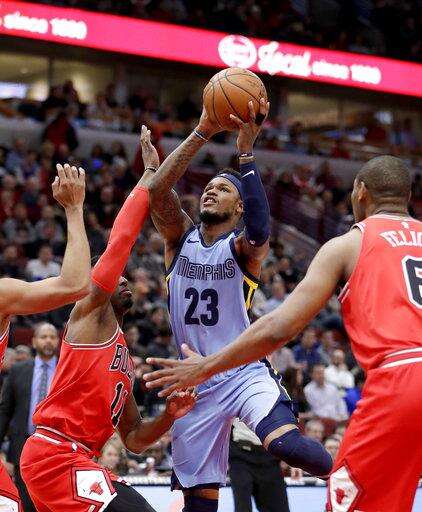 Memphis Grizzlies' Ben McLemore, center, shoots between Chicago Bulls' David Nwaba, left, and Cristiano Felicio, right, during the first half of an NBA basketball game Wednesday, March 7, 2018, in Chicago. (AP Photo/Charles Rex Arbogast) The Associated Press
