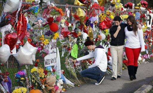 FILE--In this Oct. 29, 2014, file photo, Dana Pattie, left, kneels at a block-long fence at Marysville-Pilchuck High School memorializing a shooting there last week as a couple walks past in Marysville, Wash. Recent mass shootings spurred Congress to try to improve the background check system used during gun purchases, but experts say the system is so fractured that federal legislation being considered in Washington D.C. will do little to help keep weapons out of the hands of dangerous people. (AP Photo/Elaine Thompson, file) The Associated Press