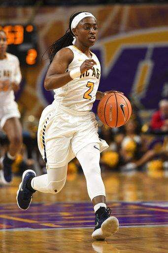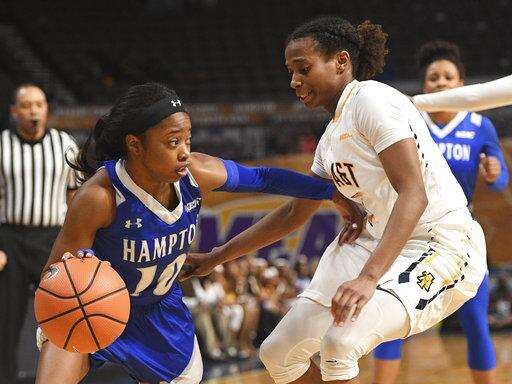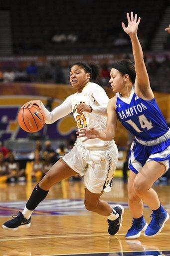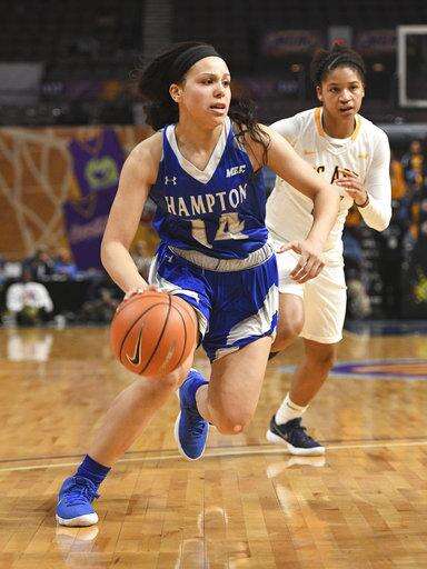 Hampton guard Ashley Bates in action against North Carolina A&T during an NCAA college basketball game in the finals of the Mid-Eastern Athletic Conference tournament Saturday, March 10, 2018, in Norfolk, Va. (AP Photo/Russell Tracy)