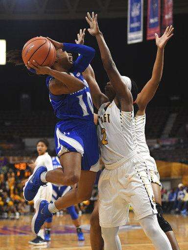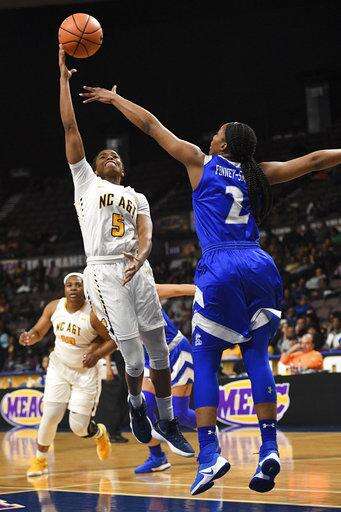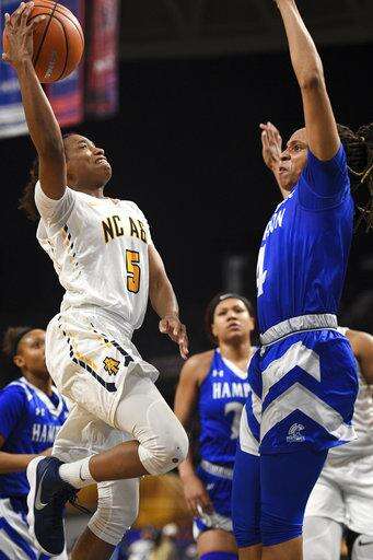 North Carolina A&T forward Jade Scaife goes up for a shot against Hampton during an NCAA college basketball game in the finals of the Mid-Eastern Athletic Conference tournament Saturday, March 10, 2018, in Norfolk, Va. (AP Photo/Russell Tracy)