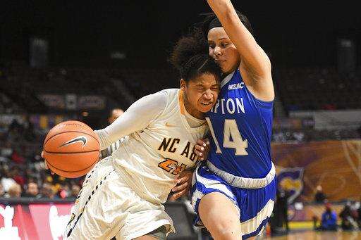 North Carolina A&T guard Cinia McCray in action against Hampton during an NCAA college basketball game in the finals of the Mid-Eastern Athletic Conference tournament Saturday, March 10, 2018, in Norfolk, Va. (AP Photo/Russell Tracy)